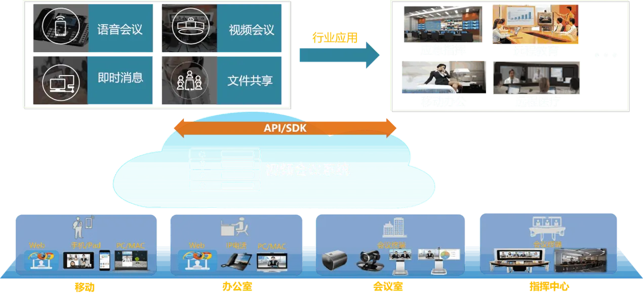 该系统广泛适用于多种场景,包括政企单位的大中型会议、日常办公的桌面会议、出差或紧急情况下的移动会议、以及突发事件的应急指挥调度。